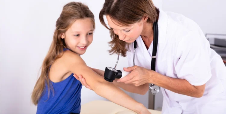 Если у детей обнаруживаются проблемы с кожей головы, волосами, образуются проплешины или выпадение волос, необходима консультация дерматолога. Также стоит пойти к врачу при появлении непонятных пятен на коже лица и тела, проявлении сосудов под кожей, синячков или красных точек, похожих на укол иглой.Потребуется дерматолог при наличии угревой сыпи у подростков, корок на голове, изменения запаха пота, нарушений цвета, формы и структуры ногтей на руках или ногах. Также нужна консультация при трещинах и мокнутии кожи, образовании бляшек, корочек, наростов и бородавок, родинок и невусов.